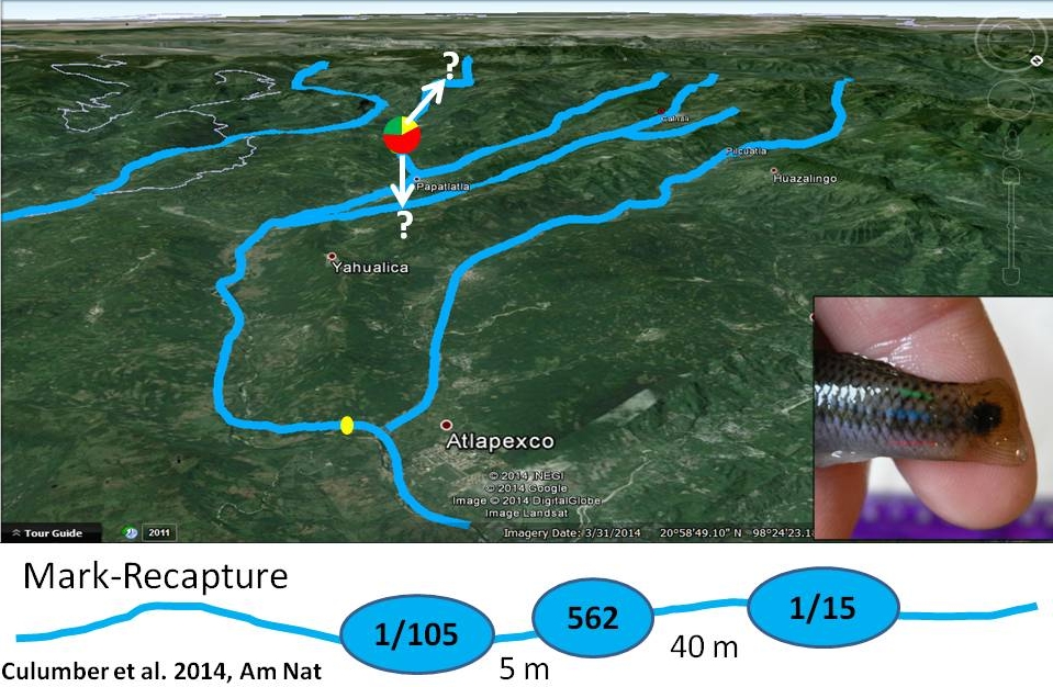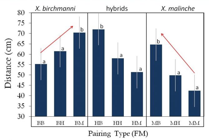 The evolutionary dynamics of natural hybrid zones are often considered to be dominated by migration-selection balance; i.e., inward migration of pure species and selection against hybrids. Several populations in natural hybrid zones of Xiphophorus fishes exhibit significant population structure where pure species and hybrids all co-exist. The maintenance of hybrids at intermediate elevations is promoted largely by environmental heterogeneity and physiological adaptation (Culumber et al. 2012, J Evol Biol), but the forces maintaining pure species – despite hybridization was a mystery. Combining population genetics, mark-recapture, and behavioral assays we found that pure species are reproductively isolated in terms of direct mating, that migration of pure species cannot account for temporally robust population structure, and that pure species females stay significantly farther way from males of the opposite species. Thus, female association preferences and subsequent mating patterns contribute to maintaining population structure. However, despite a complete absence of mating between pure species, both species readily mate with hybrids which represents a mechanism for ongoing gene flow between reproductively isolated species.