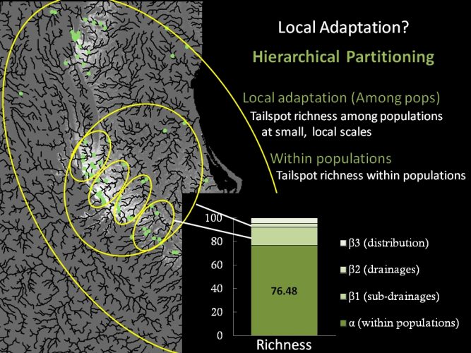 Xiphophorus variatus has an interesting polymorphism in pigmentation called “tailspots”.  This polymorphism is interesting because individuals from the same population that differ in a single allele not only have different tailspot patterns but also differ in physiological response to environmental stressors.  Research on X. variatus has including, testing female mate choice, male-male aggression, ecological modeling, and physiological assays.